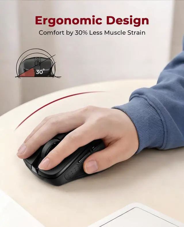 • Less Muscle StrainThis advanced ergonomic mouse features a 30° handshake angle, contoured grips, and a premium matte finish for comfort.