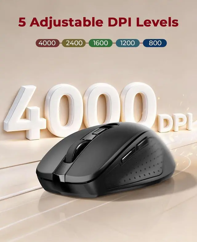 • 5 Adjustable LevelsThis mouse has 5 DPI settings (4000/2400/1600/1200/800), letting you customize for precise work or fast browsing. Perfect for your laptop/PC