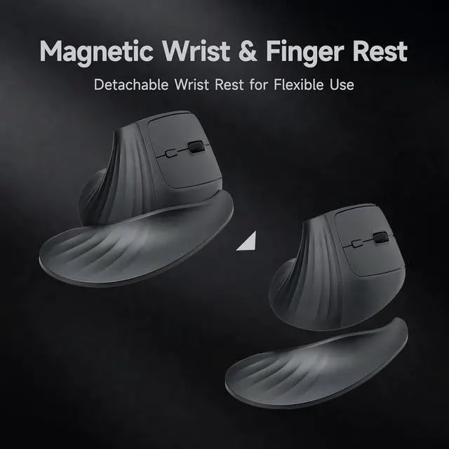 Vertical with Magnetic Wrist Rest - This ergonomic wireless mouse is designed at a natural 46° tilt to reduce arm & shoulder stiffness, wrist strain. Comes with a magnetic detachable wrist rest featuring a finger rest and arm pad for extra support. Easily removable for flexible use.