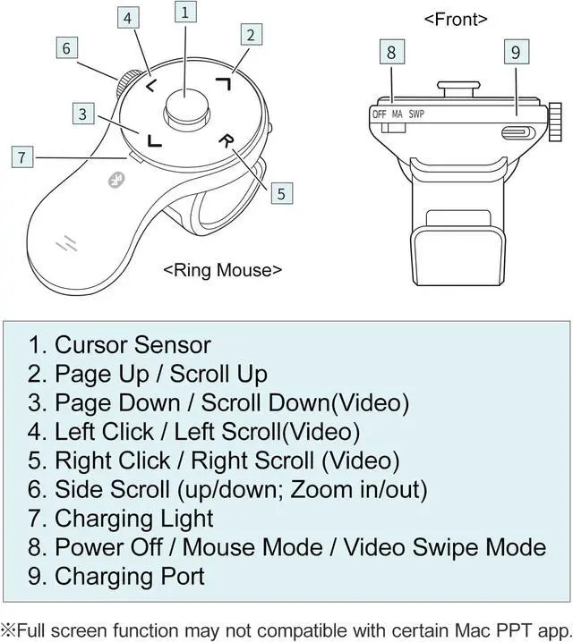 3 in 1 Finger Wearing Mouse - This SANWA finger mouse features 4 keys and a button sensor, allowing for flexible use on/off the table. It works as a regular mini mouse, a wireless powerpoint clicker, a short video scroller, and a page turner for ebook (like kindle APP). Enable easy control of your desktop PC, laptop, phone, tablet, and TV screen during meetings, watching movies, reading, browsing, swipe videos, etc.
