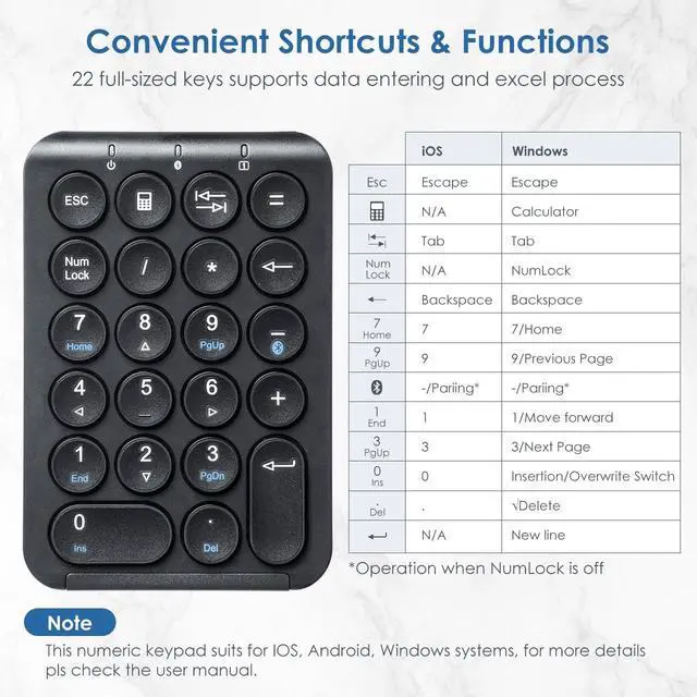 Multi-Function 22 Keys Numpad - With 22 full-sized keys, this Bluetooth numpad supports daily data entering and Excel processing functions, like 0-10 numeric, Numlock, tab, home, esc, +/-, /, =, previous/next page, delete, enter, insertion/replacement, etc. Also, it has a shortcut key for quick access to the calculator. It's ideal for data entry, excel processing, accounting tasks, sp