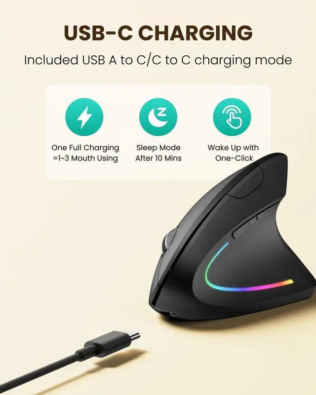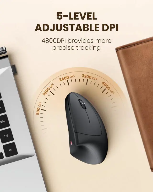 Vertical ergonomic designPOJTK ergonomic mouse adopts a scientific vertical design with an angle of 58 degrees to the desktop. It fits the curvature of the palm very well encourages a healthy and neutral handshake posture and provides ultimate comfort. Promote smoother movement reduce stress on the wrist and arm and relieve wrist muscle fatigue and pain. Multiple connection methodsThis vertical ergonomic mouse uses three connection methods: Bluetooth 5.3 + 2.4GH z USB A+USB C which can switch seamlessly between two devices without repeatedly plugging and unplugging the USB receiver. When connecting devices via Bluetooth you can save a USB A or Type C port. It is very suitable for devices without USB ports. When using the 2.4GH z USB connection mode you only need to plug in the USB receiver to quickly connect. It is equipped with both USB A and USB C receivers. When there is only a Type C interface on the device plug the USB C receiver into the USB A receiver and then plug it into the Type C interface of the device to use it. 5-level adjustable high DPIThe vertical mouse with advanced optical tracking technology has 5 levels of adjustable DPI up to 4800DPI (800/1600/2400/3200/4800). High numerical DPI provides higher sensitivity than ordinary optical mice ensuring that the mouse can achieve accurate tracking on various surfaces. Rechargeable MouseThe wireless vertical mouse is rechargeable and does not require additional batteries saving the cost of purchasing batteries. After a full charge it can be used for 1-3 months depending on usage habits and daily usage time.