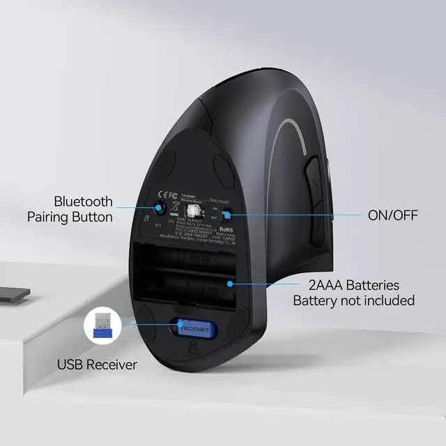 Seamless Switching Between Three DevicesThe ergonomic mouse features Bluetooth ( 5.0 / 3.0 ) and 2.4GH z USB A modes for connectivity. When connected via Bluetooth The vertical mouse can effectively reduces the usage of your USB-A port (Bluetooth mode can connect to two devices simultaneously) In 2.4GH z connection mode simply plug in the USB receiver for a quick connection. Press and hold the bottom button of the mouse for 3 seconds to enter the connection and pairing state. Short press the button to switch connection modes and improve work efficiency.