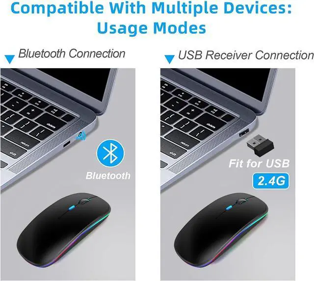 Dual-Mode Bluetooth Mouse (BT 5.2 + 2.4GH z) The dual-mode wireless mouse allows you to seamlessly switch between two devices using a single mouse with a simple switch. You can connect to one device via Bluetooth and to another device via a 2.4GH z USB receiver.