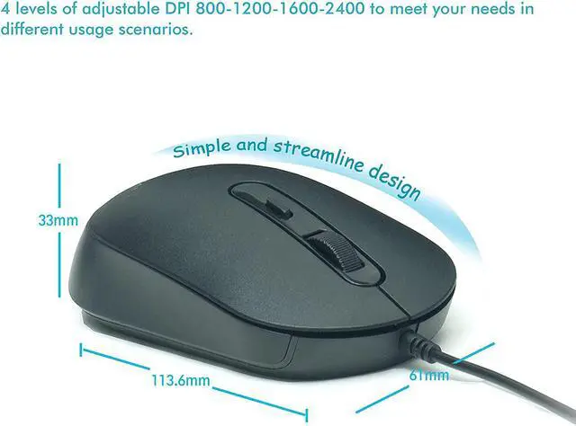 Ergonomic designSize: 4.47 * 2.4 * 1.3 inches (L*W*H) with 4.92 -foot long cable. Symmetrical design is suitable for left and right handed use and the streamlined shell makes it very comfortable to use all day. USB Optical Mouse High-speed precision optical mouse to ensure fast response and smooth operation. 4 levels DPI (2400-1600-1200-800) (default 1200) can be adjusted freely to meet your daily office online learning home design business and travel needs. Noiseless Click This usb wired mouse have 90% noise reduction function. The quiet click eliminates your worries about disturbing others allowing you to better focus on your work. There is almost no noise when the scroll wheel rolls slowly.