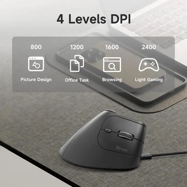 This vertical mouse supports: Multi Task Window Switch; Web Page Switch; Zoom in/out; Volume & Screen Brightness Adjustment; DPI Display; Connection Channel Display; Power Status; Connection Status; Operating System Display; Make your work and play more convenient. Triple-Mode Connection -