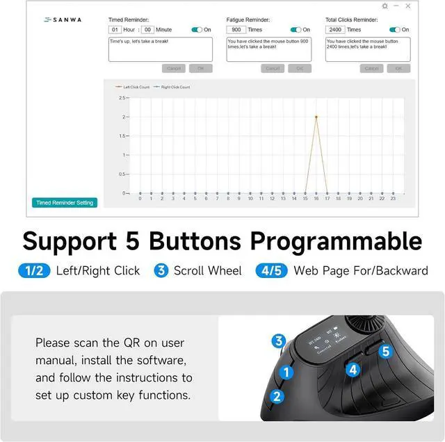 Note: When connected with wire this ergo mouse cannot switch between other 3 devices. Only on 2.4G or Bluetooth mode it can be switched. Customizable Buttons with Software - Supports buttons customization through SANWAs software (see manual for details). Download and install to easily assign functions to buttons.