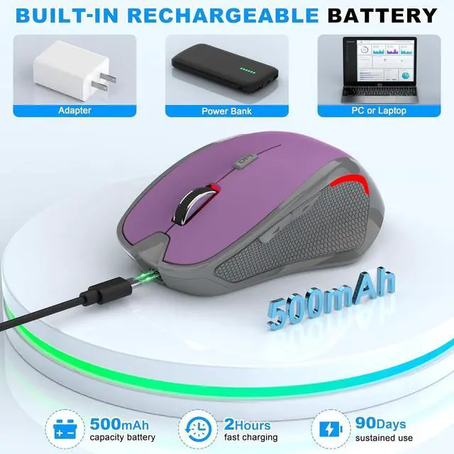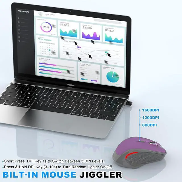 It simulates realistic mouse movements with adjustable intervals. Press and hold the DPI button for 310 seconds to activate Jiggler Mode and press again for 310 seconds to deactivate. Perfect for multitasking without interruptions on Mac Windows or Linux systems3 Adjustable DPI Short Press for 1 second to switch between 3 adjustable DPI levels (800/1200/1600) on this office mouse. The advanced optical sensor ensures accurate smooth tracking on any surface whether youre working on detailed tasks like graphic design or simply browsing the web. Perfect for office work creative projects and everyday useRechargeable & Long Battery LifeRechargeable Computer Mouse with a 500mAh lithium battery lasting up to 500 hours on a full charge.