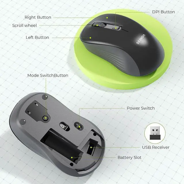 Operation: Simply insert the battery power on the mouse and press the mode switch button to choose between Bluetooth mode or 2.4G wireless mode depending on your preference. Pair the mouse with your computer via Bluetooth or plug in the receiver and you're all set to start using it immediatelyEfficient