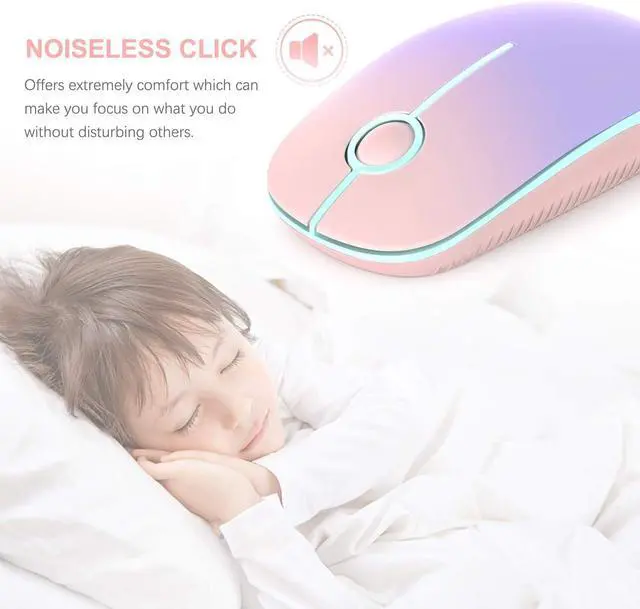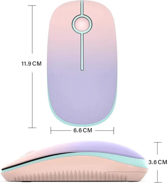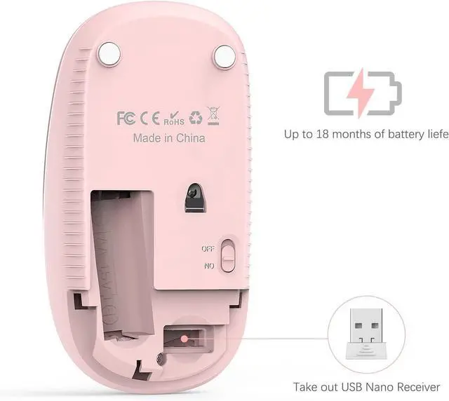 Rated to 5 million comfortable clicks. Turn into sleep mode in 8 minutes of inactivity for energy saving easily activated by clicking any button. 1 AA Battery (NOT Included) is needed for this mouse. Ergonomic Shape & Impressive Color - Slim ergonomic design and smooth sleek surface for an incredible user experience. Unique gradient pink to purple show your difference and romance. Wide Compatibility - Work with Windows XP Windows Vista Windows 7 Mac OS X 10.4 etc.