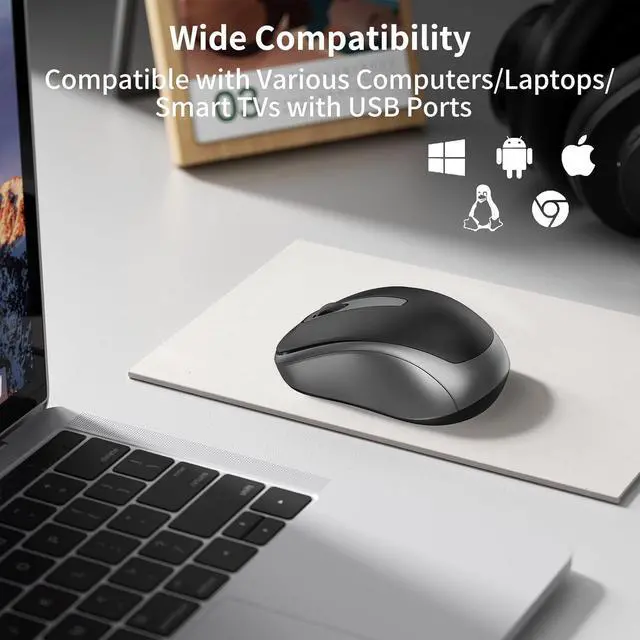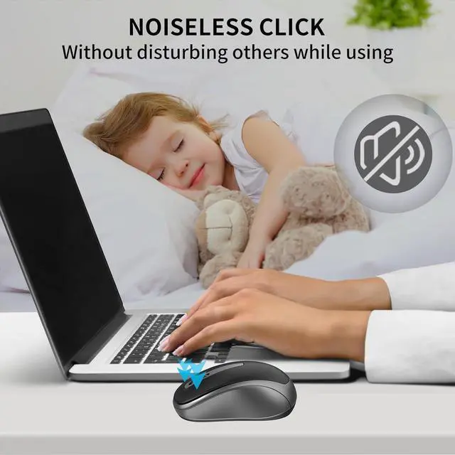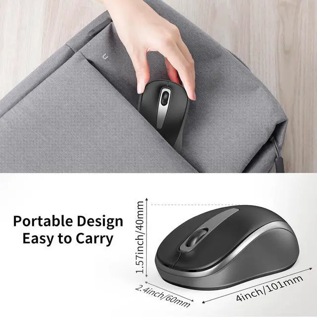 Silent ClickSpecial soundless design for the right and left buttons make you concentrate on working or playing games without disturbing others. Plug & PlayTiny wireless receiver conveniently slots into your computer's USB port taking up minimal space. USB-receiver stays in your PC USB port or stows conveniently inside the wireless mouse when not in use. Portable Size & Ergonomic DesignWith compact size ergonomic design make it easy to store in bag for traveling. Frosted surface this wieless mouse will fit comfortably in your hands Provide you with a comfortable office experience. 2.4GH z Stable Connection 2.4GH z wireless transmission technology provides a powerful and reliable connection up to 33ft the wireless mouse will turn to sleep mode in 10mins of inactivity and can be activated by clicking any buttonsUniversal CompatibilityWell compatible with Windows7/8/10/XP Vista7/8 Linux and Mac OS X 10.4 etc.