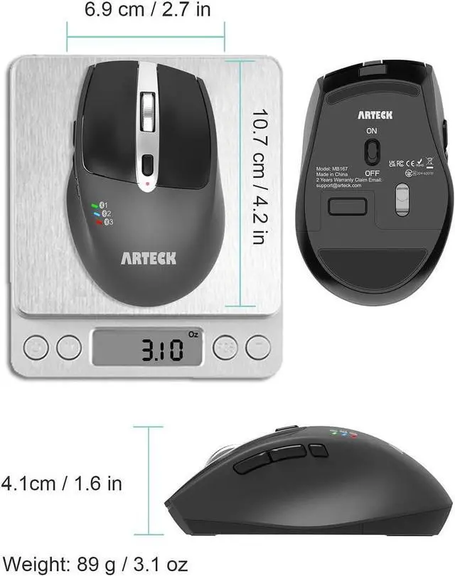 What You Get: Arteck MB167 Multi-Device Bluetooth Mouse, USB-C charging cable, welcome guide, our 24-months warranty and friendly customer service.