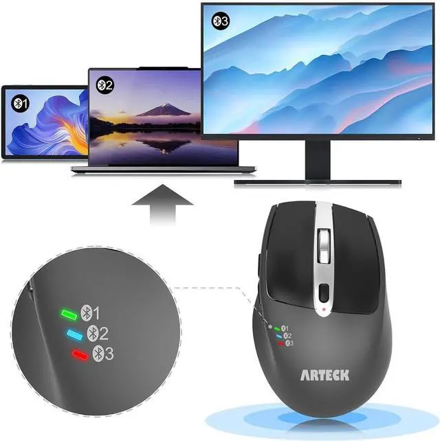A Single Clicking: This mouse is able to connect to 3 Bluetooth enabled devices at the same time. You can switch between 3 Bluetooth devices with a single button clicking.
