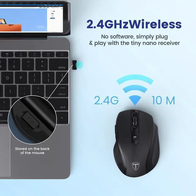 Faster Wireless Transmission Speed 33FT/10M 2.4G wireless connection reduces all the interference and delays. Just plug the USB receiver into pc or laptop and your D-09 works instantly. No delay, no interference. Mini usb receiver is stored back of the mouse, beside the battery.