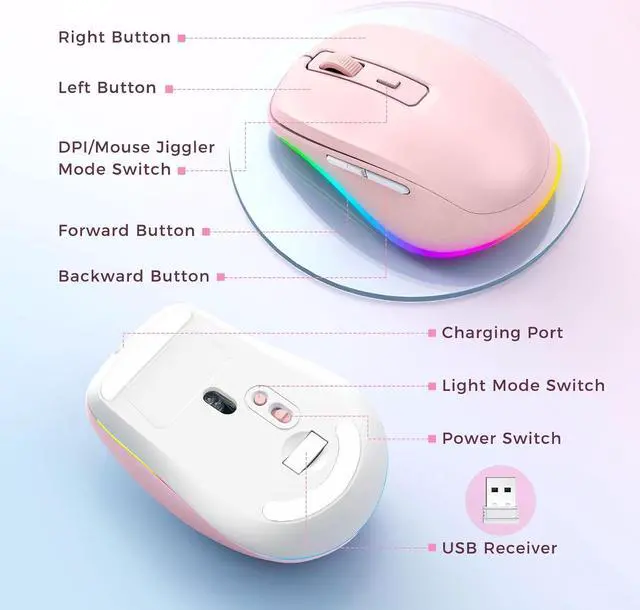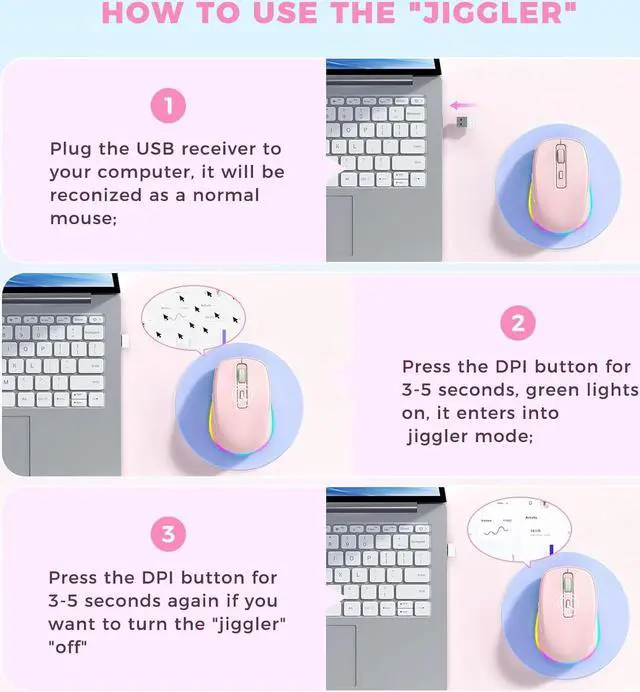 Light Up Mouse & Mouse wiggler 2 In 1 -- If you working from home and was tired of being a slave to your computer, this mouse and jiggler in 1 could be your choice, just press and hold the DPI button 3-5seconds to set it on jiggler mode to keep your computer from locking when you have to step away