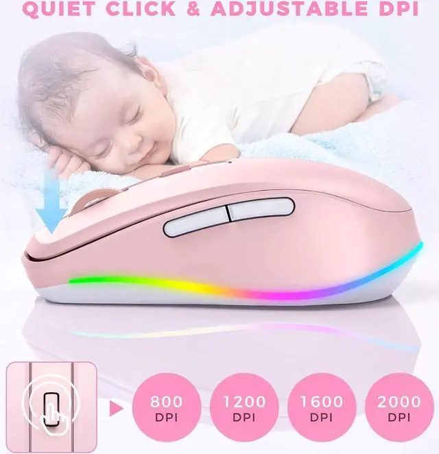 Rechargeable Computer Mouse with 4-Adjustable DPI -- This high-precision mouse has 4 levels of adjustable DPI(800-1200-1600-2000)with optical sensors that work on almost all surfaces. Built-in durable rechargeable battery, could be recharged easily with the included USB-C cable. Silent click mouse reduces 90% noises, which makes it an ideal office/home/travel mouse