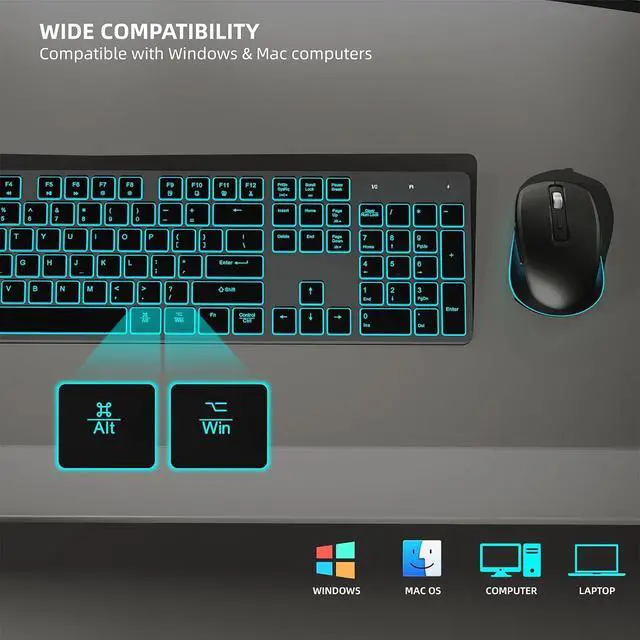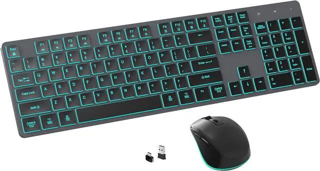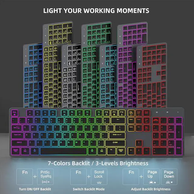 Backlit Keyboard and MouseThe Backlit wireless keyboard and mouse both features 7-color switchable backlight and 3-level adjustable brightness. It offers you a distinct visual typing experience. Even in a dark condition, the illuminated keys enable you to type effortlessly. Additionally, you can adjust the light brightness whenever you want or turn off the light to conserve power