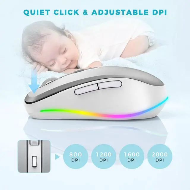 Rechargeable Computer Mouse with 4-Adjustable DPI -- This high-precision mouse has 4 levels of adjustable DPI(800-1200-1600-2000)with optical sensors that work on almost all surfaces. Built-in durable rechargeable battery, could be recharged easily with the included USB-C cable. Silent click mouse reduces 90% noises, which makes it an ideal office/home/travel mouse