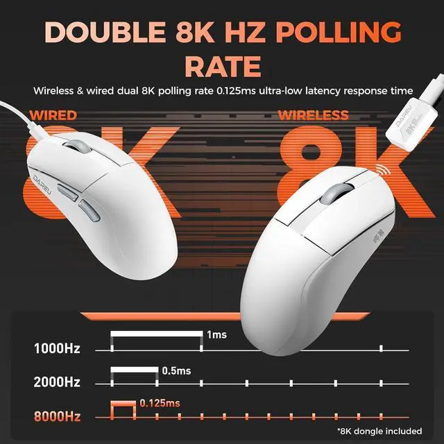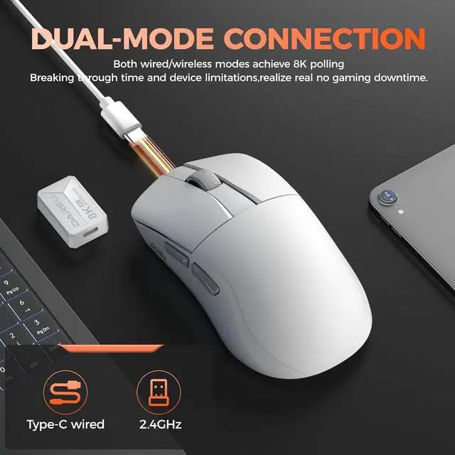 DUAL 8K POLLING RATE GAMING MOUSE - Featuring an 8000 Hz polling rate in both wireless and wired modes, the light gaming mouse delivers up to 8 times more data reports per second than the standard 1000 Hz rate, ensuring the fastest response time and minimal input latency, providing seamless updates between the mouse and monitor. The dual 8K mouse breaks through the limitations of duration and devices to realize high performance, low latency, and truly no gaming downtime.