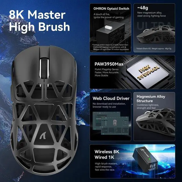 Magnesium alloy ultra lightweight 45g designThe R2 shell is made of low-density and high-strength magnesium alloy material, processed through CNC-integrated metallic frame hollow design design. Weighs 60% lighter than traditional plastic/metal mice, also makes it thiner and more durablity. The sweat-resistant metal surface ensures a secure grip during 10-hour RPG raids or FPS flick shots, with ergonomic curves optimized for claw/palm grips in high-stakes esports battles.