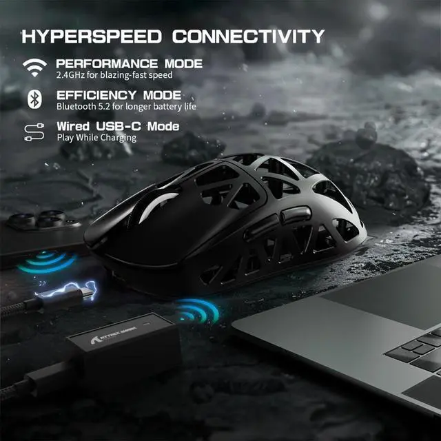 Tri-Mode Connectivity 8KHz Wireless Polling Rate The R2 mouse provides Wired/Bluetooth/ 2.4GH z connection methods. And it is equipped with HYPERSPEED Wireless technology Nano dongle receiver, which achieves a polling rate of up to 8000Hz in 2.4G wireless mode, the response time is reduced from 1ms at 1000Hz to as low as 0.125 ms. The Type-C port enables instant charge-and-play. Never miss a Warzone final circle or Genshin Impact dodge due to latency.