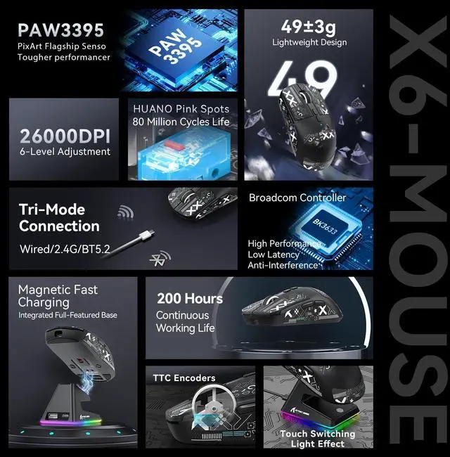 HUANO Powder Point Micro Switch& TTC EncoderBy using the high-end HUANO Powder Point Micro Switch, every click of X6 is featured with crispy sound, fast rebound and quick trigger, and its 80 million times click lifespan can ensure a durable and stable performance. It is also equipped with a TTC scroll wheel encoder which can provide a more precise positioning. All of this ensures you get excellent tactility in every touch of the mouse.
