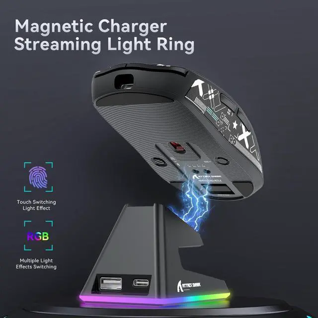 RGB Backlight Charging Base&Touch SwitchThe ATTACK SHARK X6 mouse can be quickly recharged with the cool RGB backlight charging dock, which features an RGB backlight effect that can be customized with tactile controls. With up to 200 hours of use on a single charge, you can enjoy an uninterrupted gaming experience without worrying about your mouse' s battery life or the hassle of finding a charging cable.