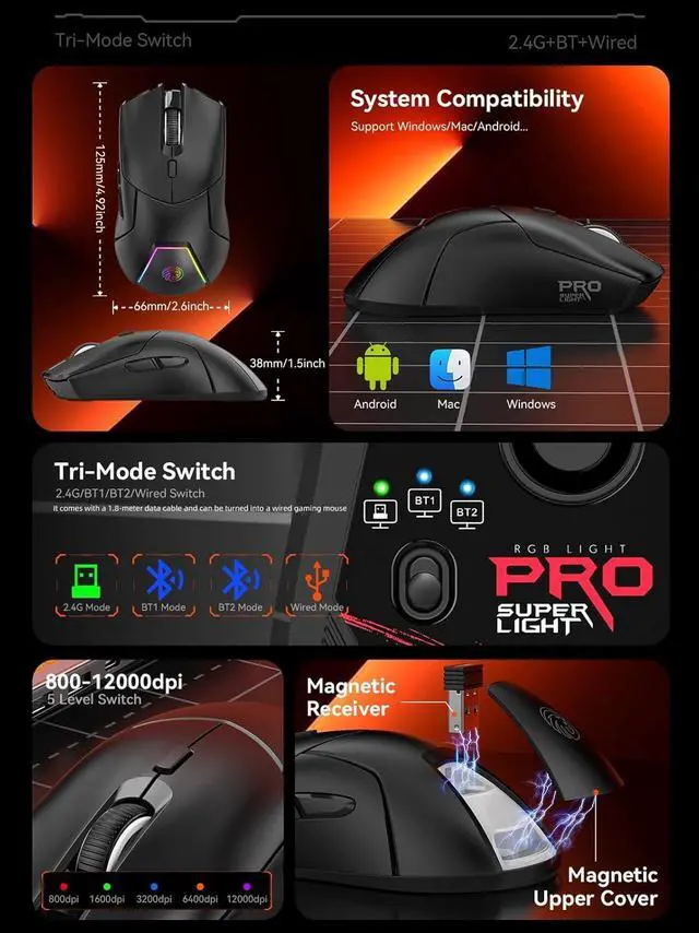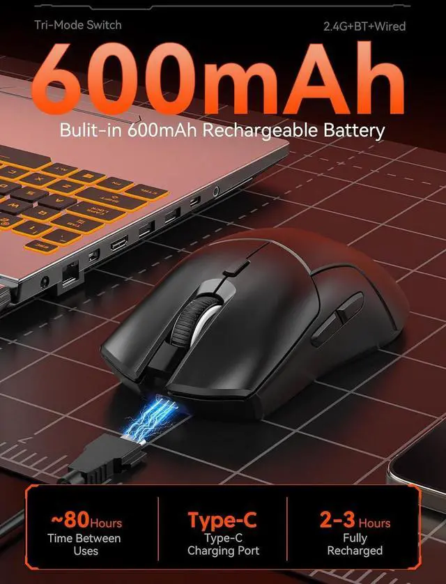 Tri Mode Gaming Mouse: Supports 2.4GH z wireless, Dual-Bluetooth, and USB-C wired connections. Stable Bluetooth and USB wireless let you connect to three devices. Using the included 1.8 m cable, it turns into a wired mouse, enabling charging during use.