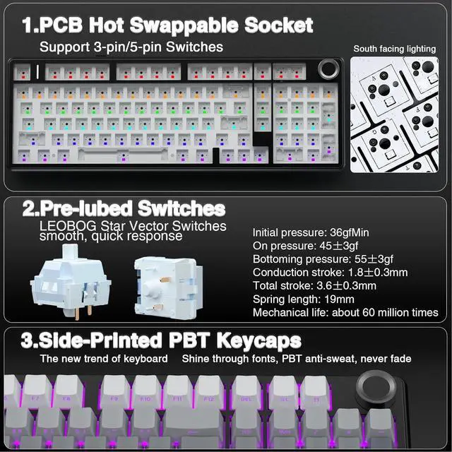 Hot-swappable Custom Keyboard: The switches and keycaps can be freely replaced(keycap/switch puller are included in the package). This customizable keyboard with hot-swap PCB allows users to replace 3 pins/5 pins switches easily without soldering issue. F99 Pro mechanical keyboards equipped with pre-lubed linear switches, bring smooth typing feeling and pleasant typing sound, provide fast response for exciting game