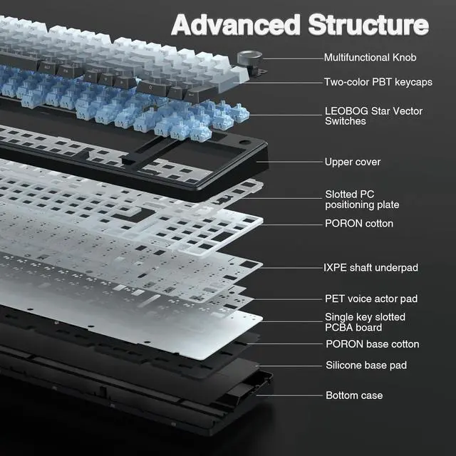 Advanced Structure and PCB Single Key Slotting: This computer keyboard features a advanced structure, extended integrated silicone pad, and PCB single key slotting, better optimizes resilience and stability, making the hand feel softer and more elastic. Five layers of filling silencer fills the gap between the PCB, the positioning plate and the shaft, effectively counteracting the cavity noise sound of the shaft hitting the positioning plate, and providing a solid feel