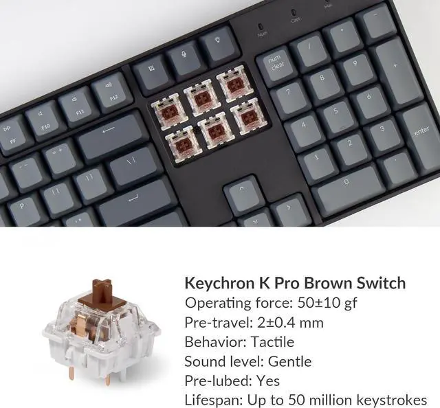 With the Keychron Pro mechanical switch providing unrivaled tactile responsiveness on the Brown switch with up to 50 million durable keystroke lifespan. N-key rollover (NKRO) on wired mode or 6KRO on wireless mode.