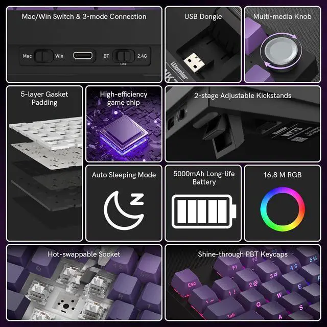 Hot Swap Socket & Custom SoftwareThis hot swappable mechanical keyboard can be replaced to most 3-pin or 5-pin mechanical switches or any keycaps as you like. We offer a free 2-in-1 keycap puller and 3 replacement switches. Even beginners can easily get started. You can also redefine keymapping, macros, and RGB backligts in the original driver. Have fun in customization