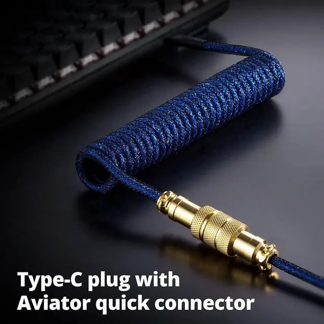 GUNMJO Starlight Coiled USB C Keyboard Cable for Gaming Keyboard, Double-Sleeved Mechanical Keyboard Cable with Detachable Metal Aviator, 1.5M USB-C to USB-A, Blue Color with Gold Aviator Connector