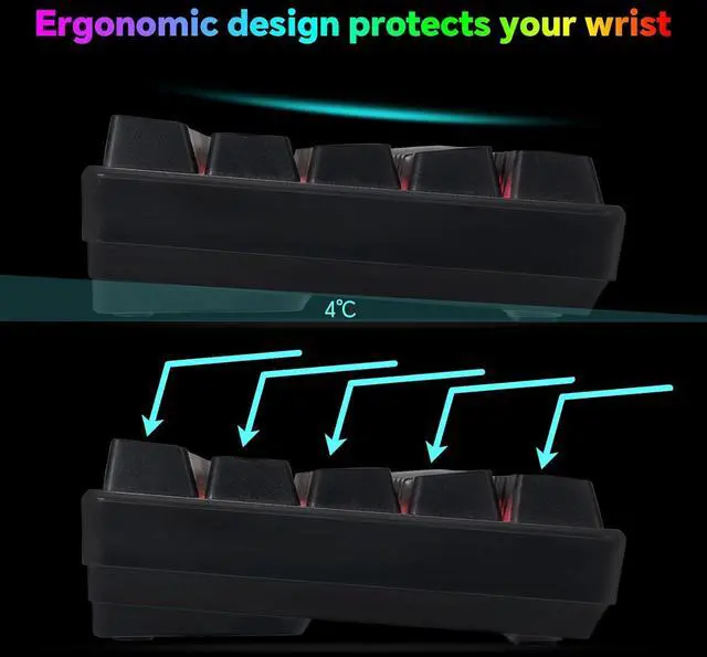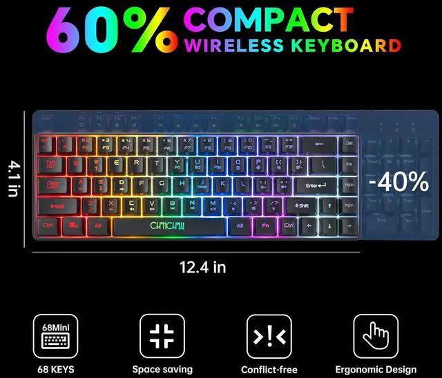 LED Backlit Light Up Keyboard and MouseThe 68 keys mini wireless gaming keyboard with built-in rainbow backlight effect, supports 1 static and 1 dynamic breathing mode, 3 brightness levels, and 4 breathing rates for choice. (Note: The light is not RGB, the light color cannot be changed). The mouse has a built-in 7-color cyclic gradual lighting effect. To be honest, this is a membrane keyboard but mechanical feel.