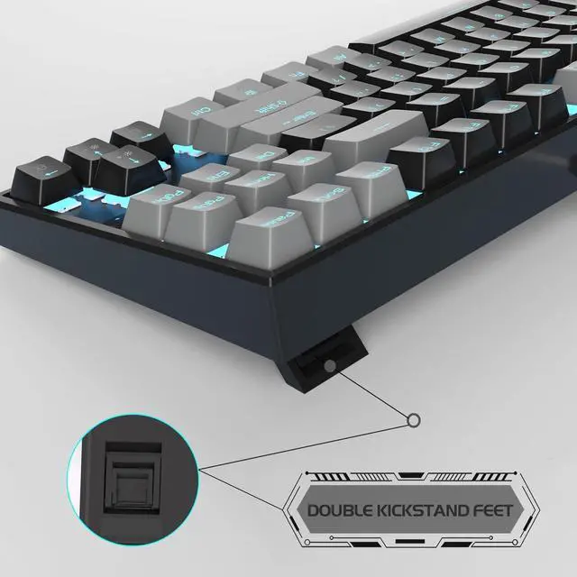 [Ergonomic mechanical keyboards]: stylish black grey mash up 75% layout, come with extra 16 red keycaps, double-shot injection non-slip suspension keycap, splash-proof design, durable metal panel enough to protect it from scratch, also firm kickstand feet adjustable typing angle.