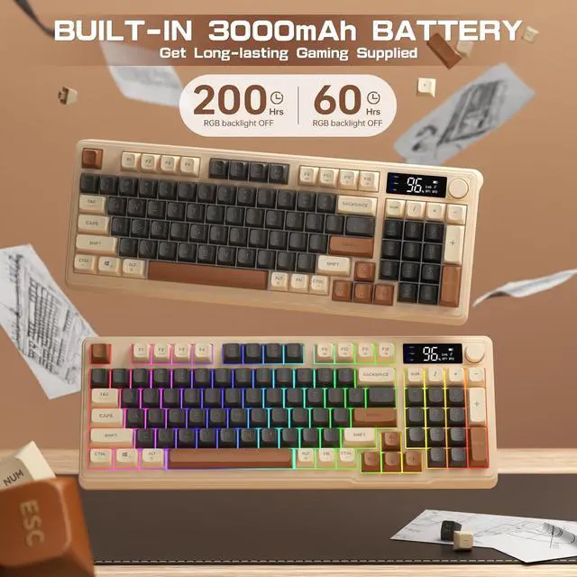 [ 2.4G /Bluetooth dual-mode connection] 2.4G and wireless Bluetooth dual-mode connection make this keyboard extremely stable and durable, with stable operation and not easy to disconnect. This keyboard comes with an LED electronic screen, built-in 2000Ah battery, ultra long battery life, real-time display of battery level and connection status, making it easy to master the operation.
