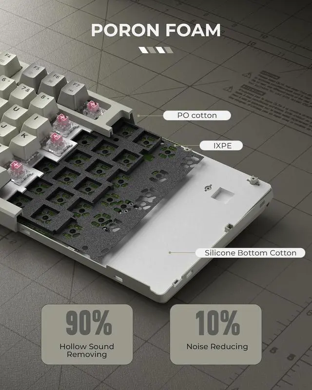 Gasket Mount&Hot-SwapThis wired mechanical keyboard adopts gasket-mounted structure for a quiet, stable and smooth typing operation, built with full-key hot-swappable PCB base, which can only be swapped with Outemu magnetic switch, using high precision stabilizer pre-lubed satelite switches to ensure a smoother typing experience with less wobbliness on the big keys.