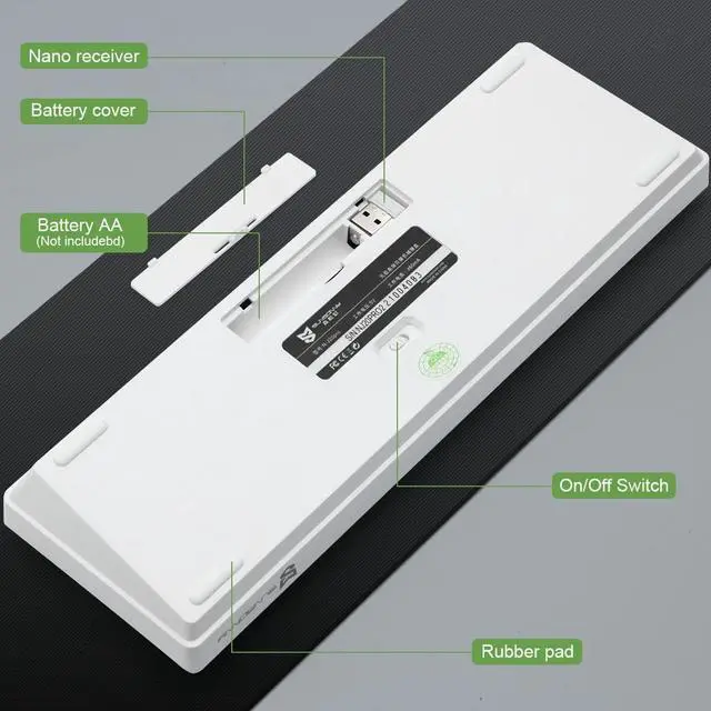 : This bluetooth mechanical keyboard is durable ABS keycaps with comfortable to touch, wear resistant characters will not fall off. This pc keyboard with concave key cap design, is comfortable and durable. Behind the led keyboard, comes with a power switch for power saving, also with battery storage and receiver storage, not lost.