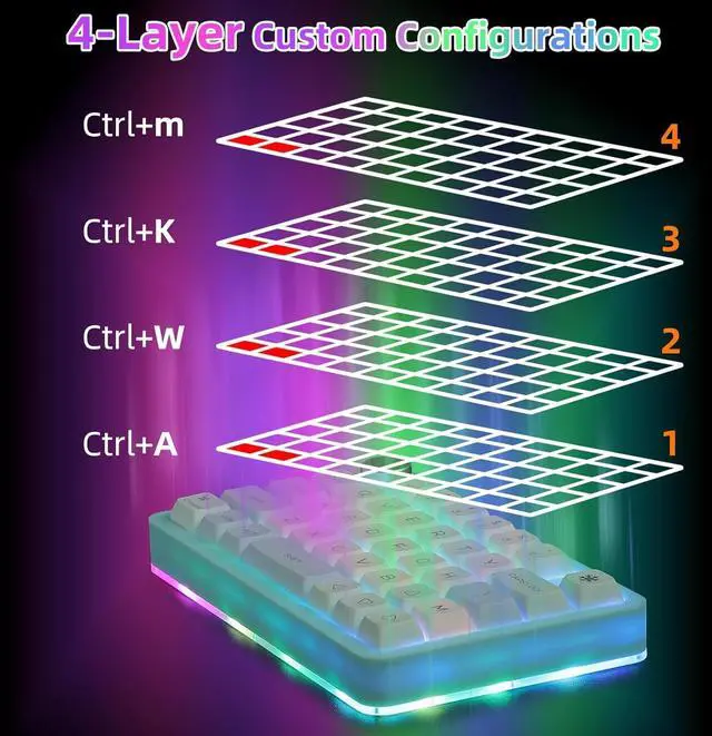 4-Layer Custom Configuration: Built-in MCU, after setting the keyboard keys, they can be stored in the keyboard' s MCU without resetting the keyboard. 4 layers of configuration can be saved to handle multiple usage scenarios. Not only suitable for gamers, but also for many other types of users, including designers and video editors