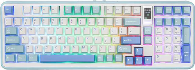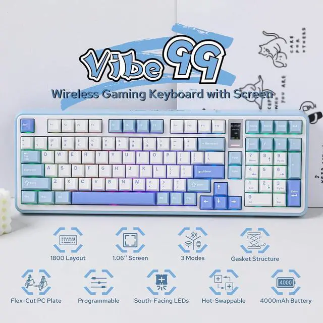 1800 Layout with 1.06 -Inch TFT Screen The Vibe99 features a streamlined 1800 layout with 100 keys, offering a more compact alternative to traditional full-sized keyboards while maintaining essential functionality. Ideal for users who need the navigation cluster and numpad but prefer a more space-saving design, the 1800 layout provides a balanced solution. Adding to its appeal is a 1.06 -inch TFT screen that can display useful information like battery status, time, and active connection mode, while also allowing you to upload and display GIF animations. The keyboard' s sleek metal decorative pieces give it a premium appearance, enhancing its advanced and stylish design.