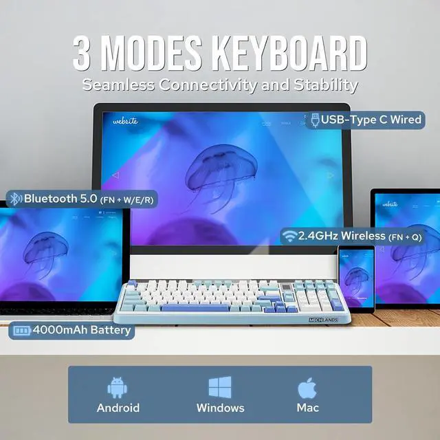 Tri-Mode Connectivity with 4000mAh Battery The Vibe99 is built for versatility with tri-mode connectivity options, including USB-C wired, 2.4GH z wireless, and Bluetooth 5.0 connections. Whether youre gaming, working, or simply browsing, this wireless keyboard offers seamless connectivity and stability. The robust 4000mAh battery ensures extended wireless usage, minimizing the need for frequent recharging and keeping you focused on your tasks.