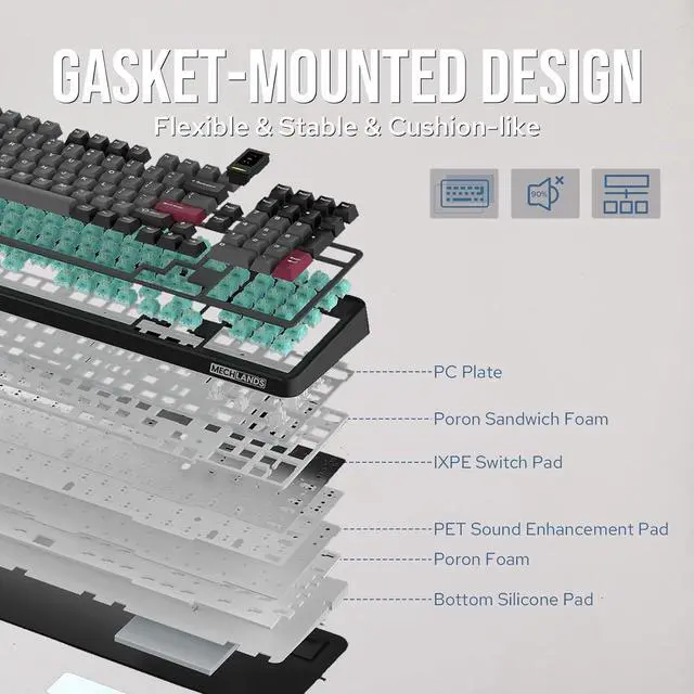 Satisfying Typing Feedback Experience superior typing comfort with the Vibe99s gasket-mounted structure. This design offers a soft, cushion-like feedback, enhanced by five layers of internal padding, including PORON Sandwich foam, an IXPE switch pad, PET film, Poron PCB foam, and a bottom silicone pad. These layers work together to provide a plush typing feel and satisfyingly deep acoustics, ensuring a delightful typing experience with every keystroke.