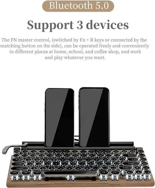 One-click switching The keyboard has two modes, wired mode and bluetooth mode, the switch key is " FN+R", when you use a desktop computer, you can turn on the wired mode, plug in the USB cable, press " FN+R", you can Type normally. When you use a laptop, tablet or mobile phone, you can turn on the Bluetooth mode, you need to turn on the Bluetooth key and power mode (the upper right of the keyboard), press " FN+R". After connecting to bluetooth you can use it normally.
