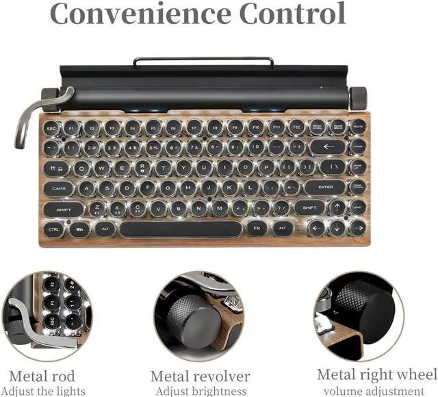 Combination of fashion and retroContinuing the retro elements of the typewriter, there will be a clicking sound when typing, the left and right sides are set with stylish texture knobs, the left side adjusts the brightness of the backlight, and the right side scrolls the page.