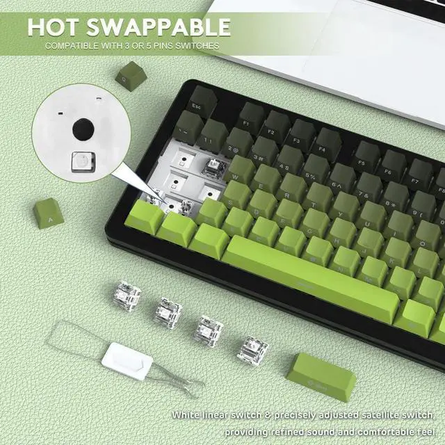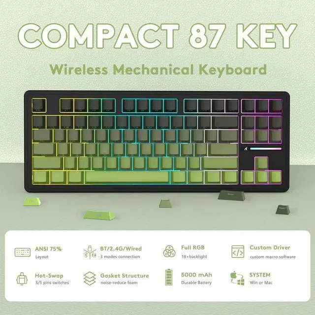 Hot Swappable KeyboardDesigned with hot swapped base, this 80% mechanical keyboard allow you freely DIY with most 3 pin or 5 pin switches to customize your own keyboard. M87PRO keyboard default comes with pre-lubricated finely-calibrated stabilizer and linear white jade switch, devoted to providing smooth typing feeling and creamy mechanical sound with fast response, offer a ultimate exciting gaming experience and help you win in the end