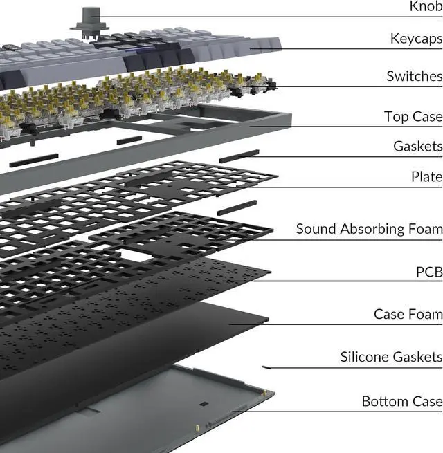 Double-Gasket Design: In addition to the gaskets on the plates, we added silicone pads between the top and bottom cases to significantly reduce the acoustic resonance between the metals and reduce the noise of the impacted metals. And integrated the PCB-mounted screw-in stabilizers for a smoother typing experience with less wobbliness on the big keys such as the space bar, shift, enter, and delete keys. You can even customize your favorite stabilizers on your own.