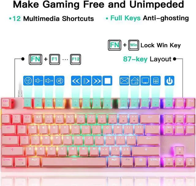 87 RESPONSIVE KEYS: No matter how many buttons press, respond or trigger at the same timeAll 87 keys have individual switches with full n-key rollover and anti-ghosting for flawless performance, The 12 combination of multimedia shortcut function, support lock" WIN" function, and lock" WIN" and lock APP key