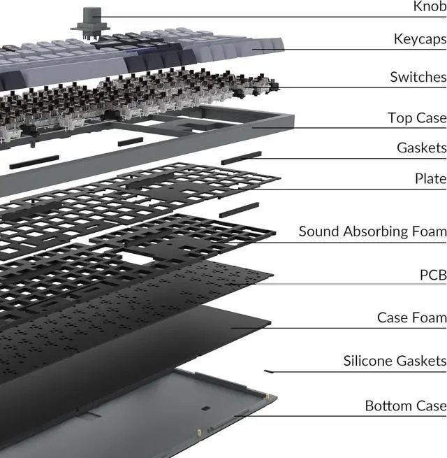 Double-Gasket Design: In addition to the gaskets on the plates, we added silicone pads between the top and bottom cases to significantly reduce the acoustic resonance between the metals and reduce the noise of the impacted metals. And integrated the PCB-mounted screw-in stabilizers for a smoother typing experience with less wobbliness on the big keys such as the space bar, shift, enter, and delete keys. You can even customize your favorite stabilizers on your own.