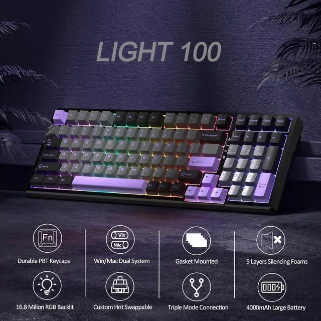 [CREAMY THOCK SOUND GASKET STRUCTURE]: LIGHT100 keyboard mounting is different from the traditional screw fixing method, but using gaskets mounted on the top and bottom sides between the panel and the keyboard shell, which acts as a cushioning layer, in addition, the keyboard is designed with five layers sound-absorbing foams filling, can effectively reduces the noise, improves the typing comfort and accuracy, and brings crisp, clean and softer typing feel.