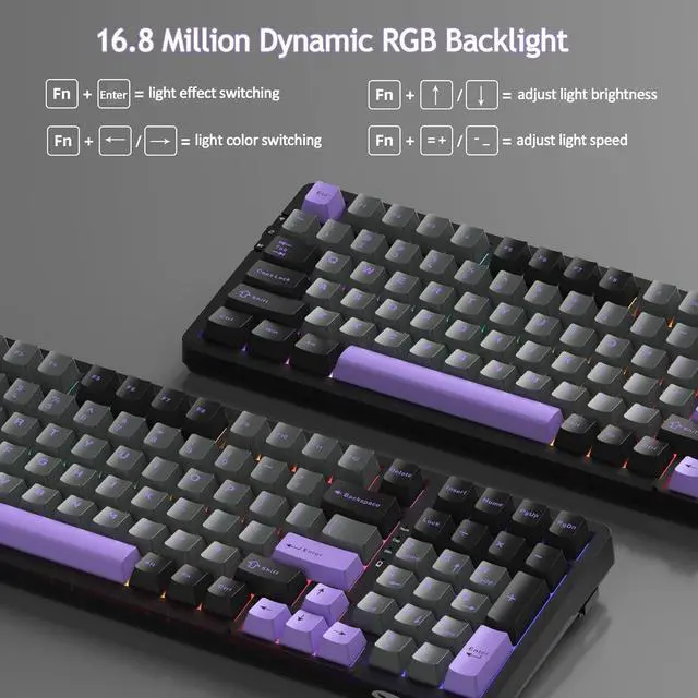 [ 16.8 MILLION COOL RGB BACKLIGHT]: The creamy keyboard with a wide choice of backlight effect and color, include static and dynamic, illuminating your desktop and enhancing the gaming experience, press Fn + Enter can toggle about 20 backlit modes, Fn + adjustable backlit colors, press Fn+ _- =+ can control backlit brightness and speed.